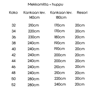 Ompelukaava sisältää naisten raglanhihaisen hupparin ja hupparimekon, joihin valittavana huppu tai korkea kaulus. Sivusaumaan voit tehdä kaavan mukaisesti taskut. Koot naisille 32-52. Ompelukaavasta löytyy kaikkien kappaleiden mitat, myös resorit löytyvät kaava-arkilta.