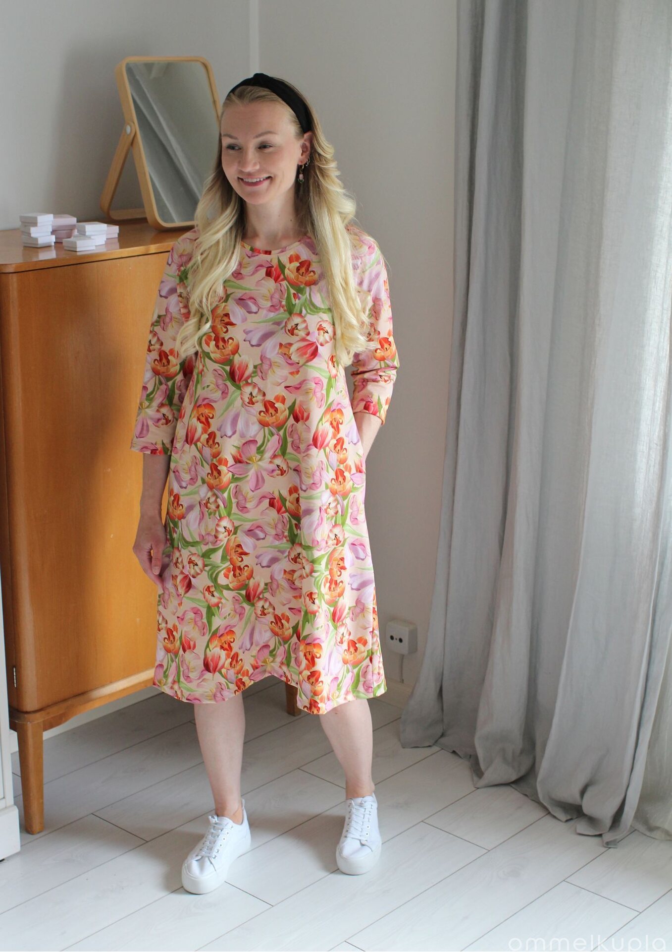 Kankaan kuosi eli kuviointi on suunniteltu Suomessa Ommelkuplalle ja samaa kangasta et siis löydäkään muualta! Se on painettu sertifioidulle kankaalle Euroopassa. Sertifikaatit takaavat tuotteen turvallisuuden ja myös sen, että tuotanto on eettistä. Voit siis huoletta ommella ja käyttää vaatetta, olemme huolehtineet edellämainituista puolestasi!
