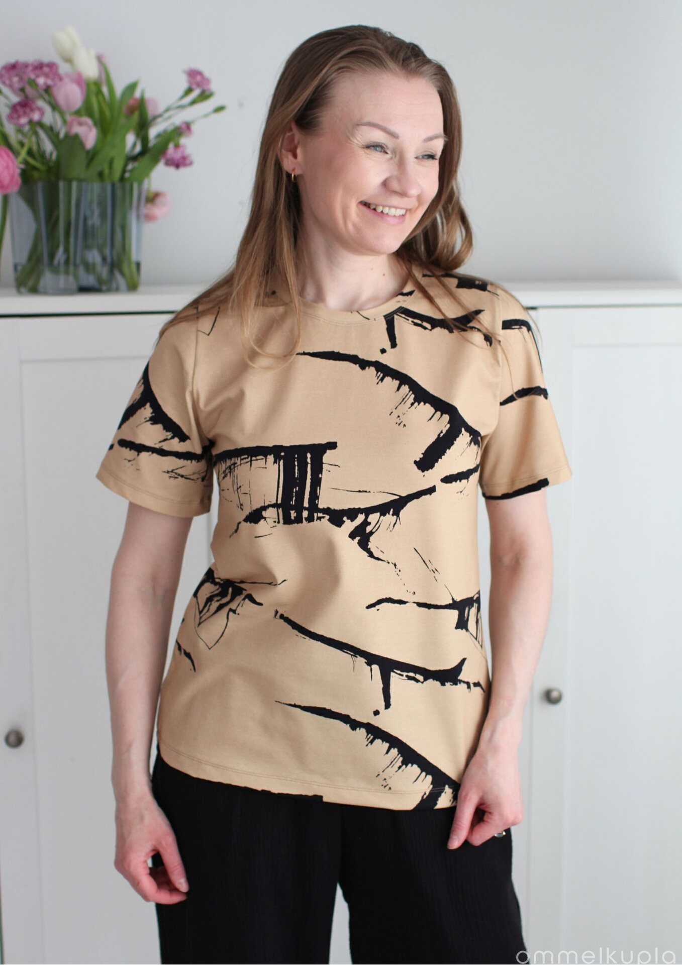 Trikoo on digitaalisesti painettu kankaalle, joten kankaan nurjapuoli on valkoinen. Tämä kannattaa huomioida pesussa ja pestä yhdessä vaaleiden vaatteiden kanssa. Digitaalisesti painetusta kankaasta ei irtoa samalla tavalla väriä pesussa, kuten esimerkiksi läpivärjätystä kankaasta (esimerkiksi yksivärinen trikoo).
