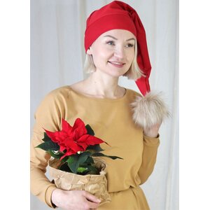 Tämä tonttulakin kaava on tarkoitettu joustaville kankailla ja parhaiten siihen sopii trikookangas. Lakissa on keskipitkä hiippa, jota voit halutessasi pidentää tai lyhentää mielesi mukaan. Jos haluat tonttulakkiin tupsun, niin valitse lapselle S- kokoinen tupsu ja aikuiselle M-kokoinen tupsu. Pipon on helppo toteuttaa ja tämä kaava sopii myös ompeluharrastusta aloitteleville.