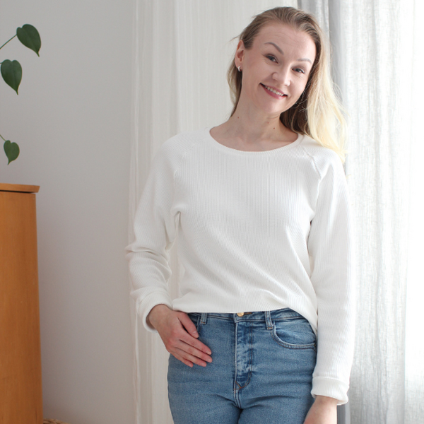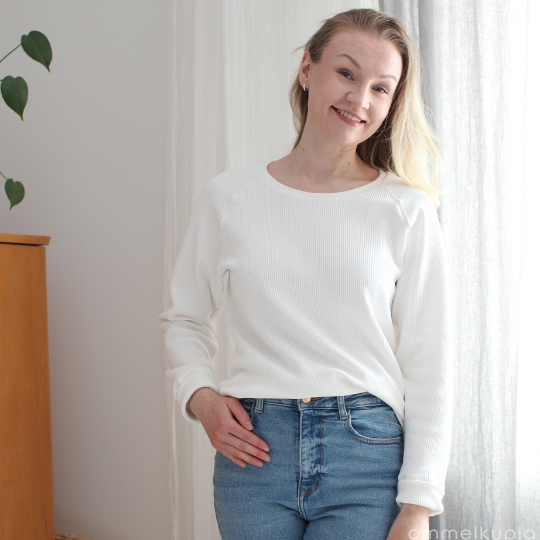 Viileä neulos vaatetusompeluun. Emilia on ihana rentoihin paitoihin, sillä se laskeutuu juuri sopivasti, mutta on kuitenkin napakka. Puuvillaneulos sisältää hieman elastaania, joten se myös joustaa hieman. Emilian pinta on raitamainen, sillä neuloksessa erottuu selvästi kapeat "oikeat ja nurjat".
