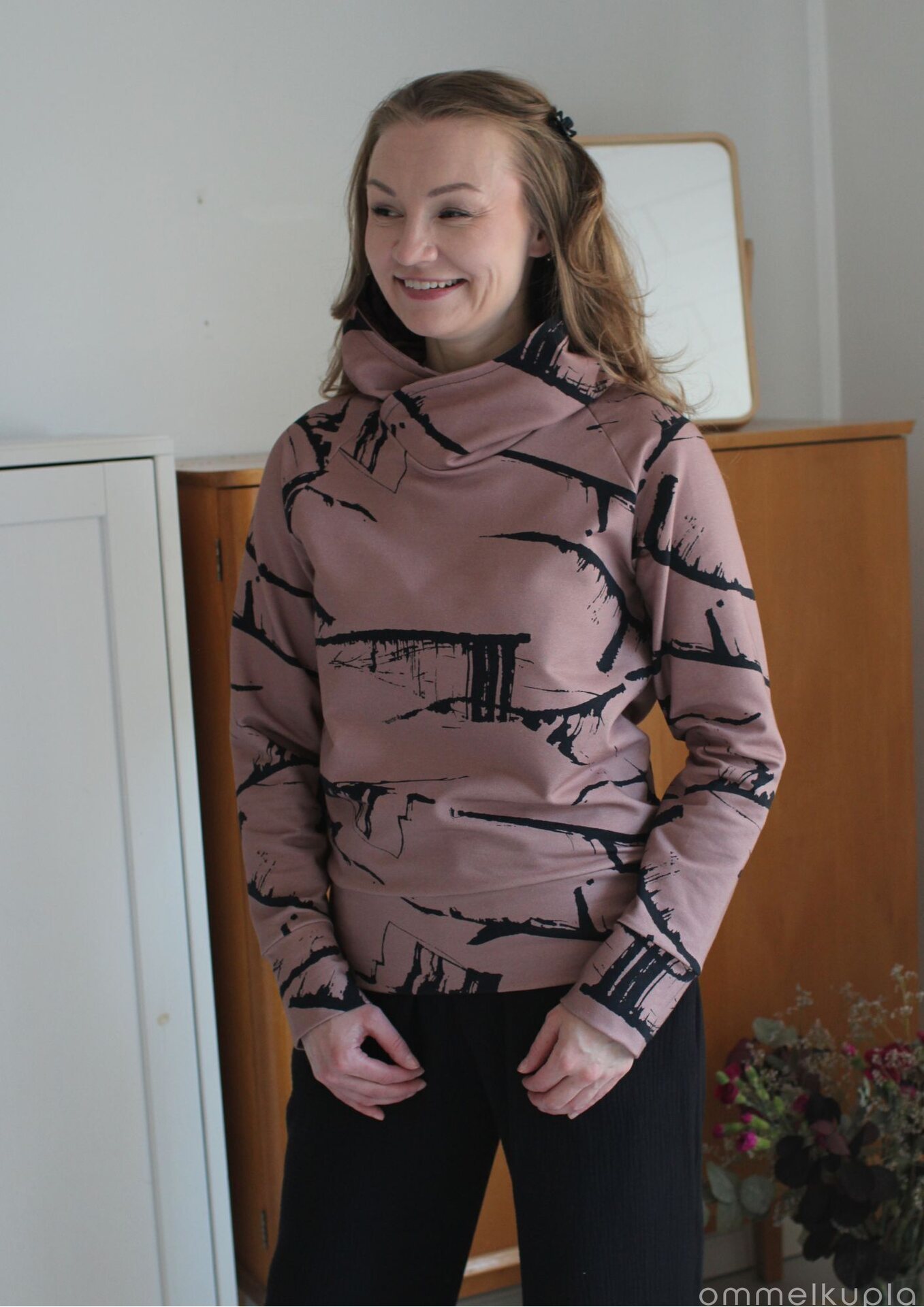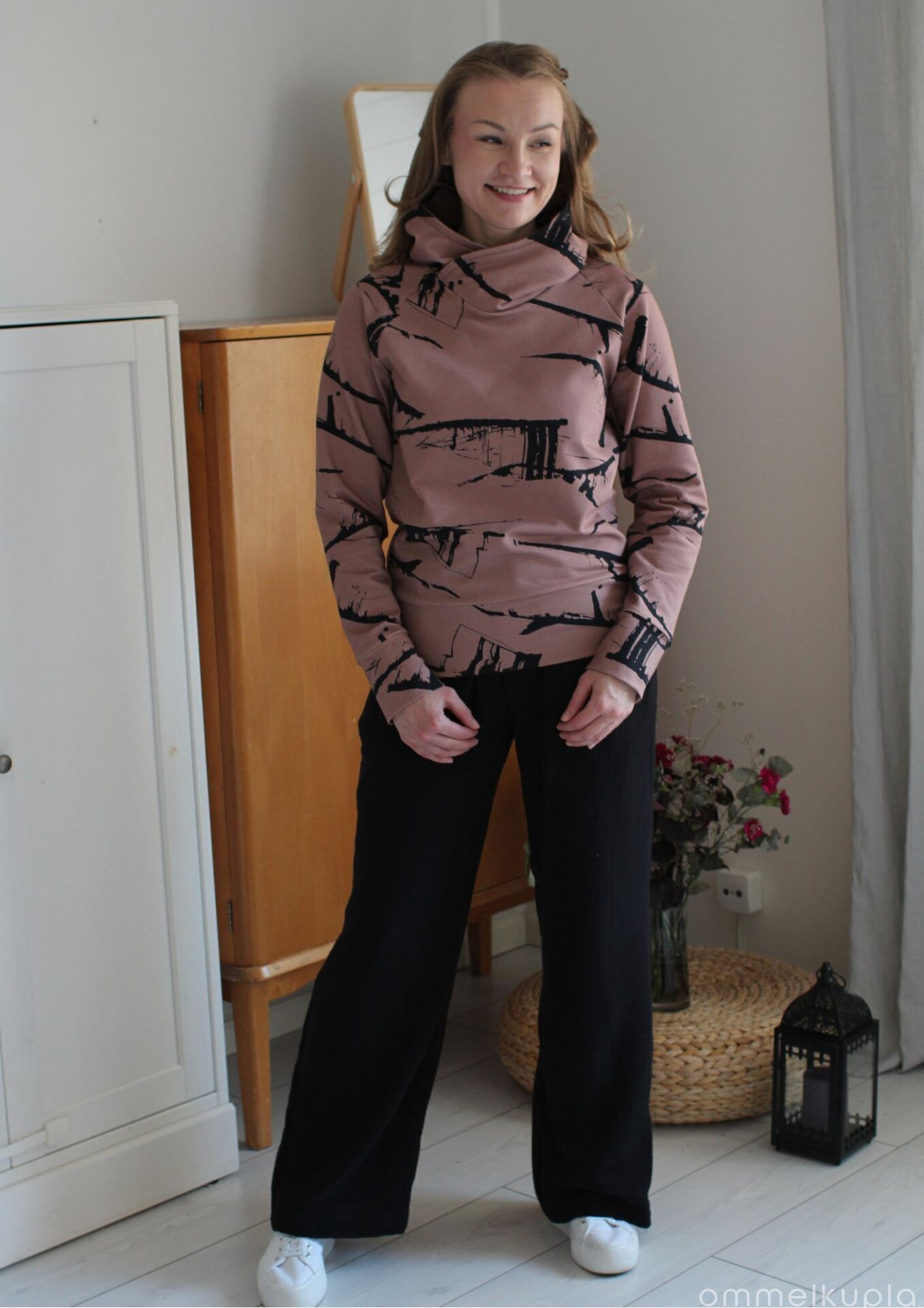 Kankaan kuosi eli kuviointi on suunniteltu Suomessa Ommelkuplalle ja samaa kangasta et siis löydäkään muualta! Se on painettu sertifioidulle kankaalle Euroopassa. Sertifikaatit takaavat tuotteen turvallisuuden ja myös sen, että tuotanto on eettistä. Voit siis huoletta ommella ja käyttää vaatetta, olemme huolehtineet edellämainituista puolestasi!