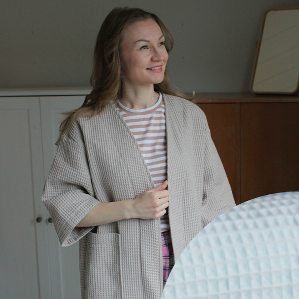 - Tarvittavan määrän vohvelikangasta yhteen kylpytakkiin tuoteen nimessä olevan kokoisena.