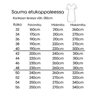Ompelukaava sisältää aikuisten koot 32-56, joista kokoa 52 käytetään rinnanympäryksellä 140cm.