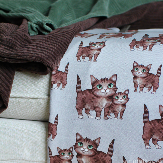 Kankaan kuosi eli kuviointi on suunniteltu Suomessa Ommelkuplalle ja samaa kangasta et siis löydäkään muualta! Se on painettu sertifioidulle kankaalle Euroopassa. Sertifikaatit takaavat tuotteen turvallisuuden ja myös sen, että tuotanto on eettistä. Voit siis huoletta ommella ja käyttää vaatetta, olemme huolehtineet edellämainituista puolestasi!