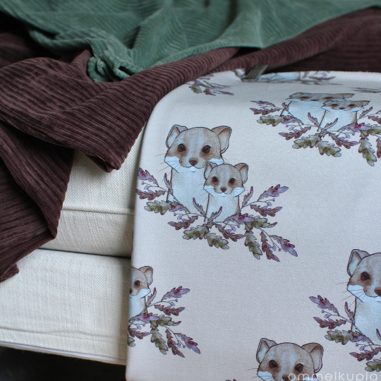 Kankaan kuosi eli kuviointi on suunniteltu Suomessa Ommelkuplalle ja samaa kangasta et siis löydäkään muualta! Se on painettu sertifioidulle kankaalle Euroopassa. Sertifikaatit takaavat tuotteen turvallisuuden ja myös sen, että tuotanto on eettistä. Voit siis huoletta ommella ja käyttää vaatetta, olemme huolehtineet edellämainituista puolestasi!