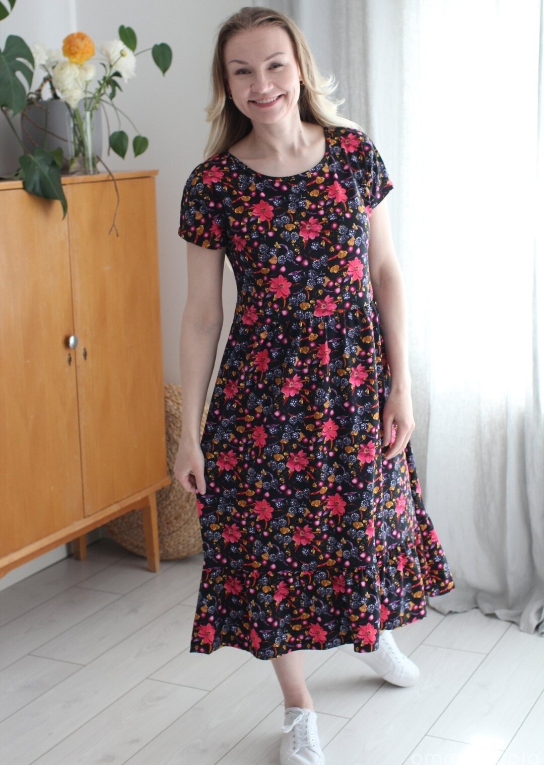 Kankaan kuosi eli kuviointi on suunniteltu Suomessa Ommelkuplalle ja samaa kangasta et siis löydäkään muualta! Se on painettu sertifioidulle kankaalle Euroopassa. Sertifikaatit takaavat tuotteen turvallisuuden ja myös sen, että tuotanto on eettistä. Voit siis huoletta ommella ja käyttää vaatetta, olemme huolehtineet edellämainituista puolestasi!