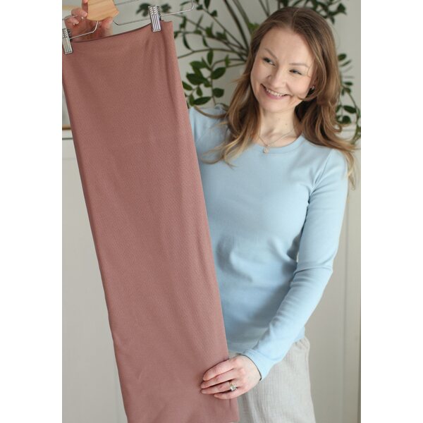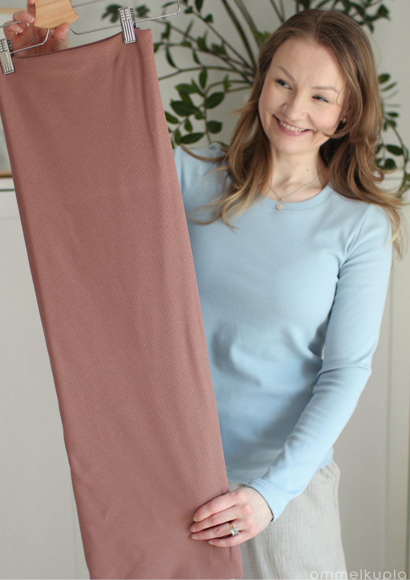 Ribbitrikoo kannattaa aina esipestä ennen ompelua. Jos aiot laittaa valmiin vaatteen myös kuivausrumpuun, vaikka sitä ei suositella, niin laita myös kuivausrumpuun ennen ompelua. Näin saat kankaan kutistettua juuri niin paljon, kuin se kutistuu valmiina vaatteena.
