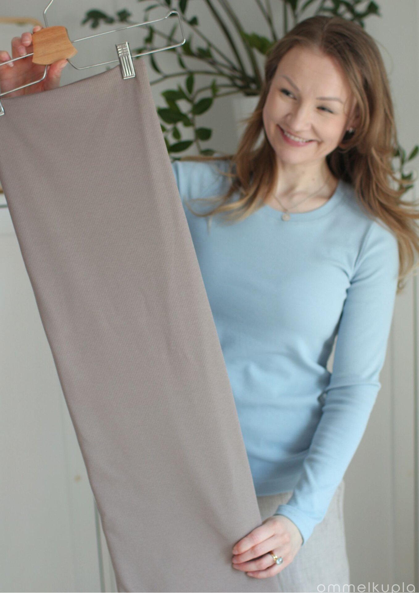 Ribbitrikoo kannattaa aina esipestä ennen ompelua. Jos aiot laittaa valmiin vaatteen myös kuivausrumpuun, vaikka sitä ei suositella, niin laita myös kuivausrumpuun ennen ompelua. Näin saat kankaan kutistettua juuri niin paljon, kuin se kutistuu valmiina vaatteena.