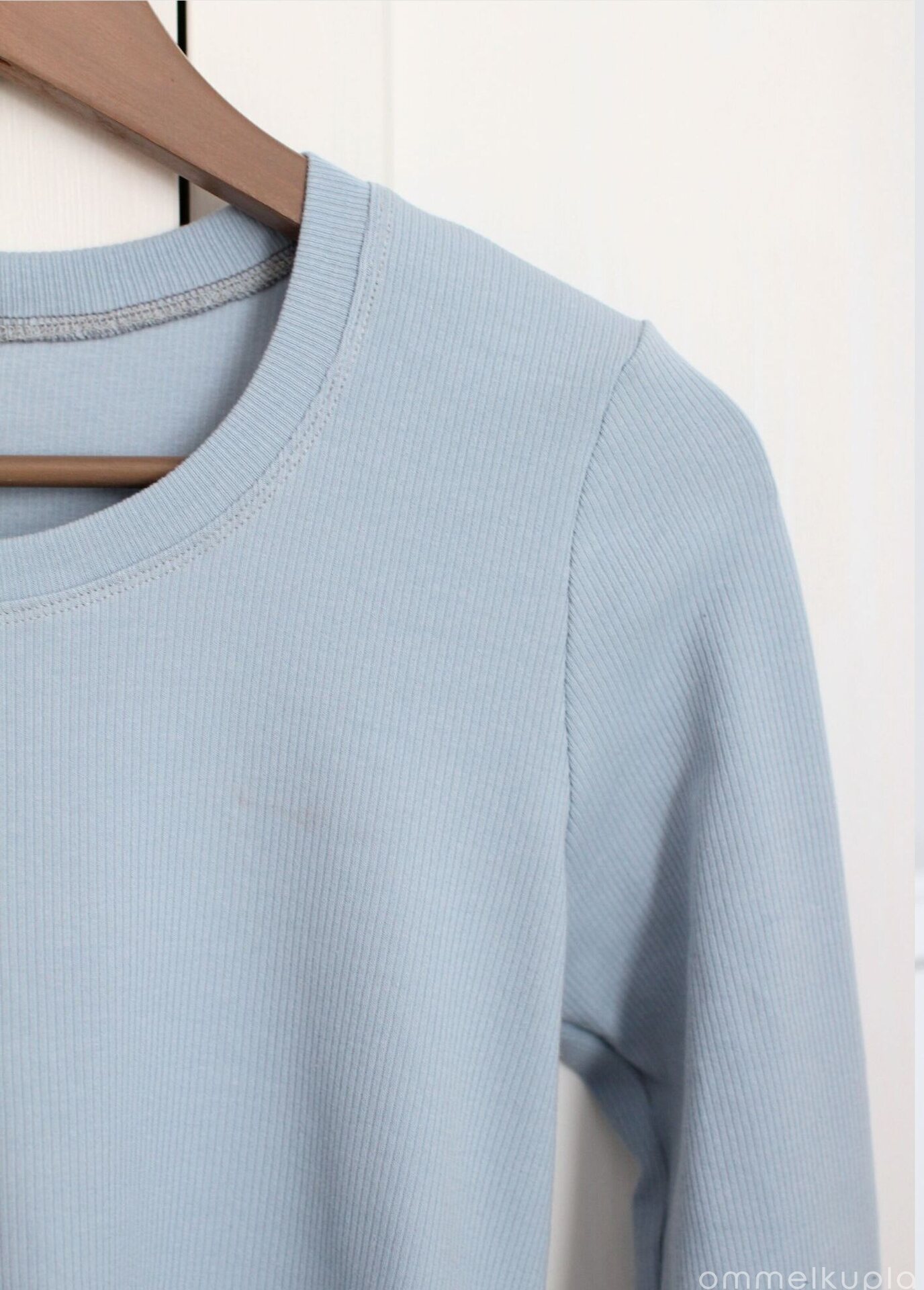 Voit huolitella paidan kauluksen/pääntien tällä samalla ribbitrikoolla.