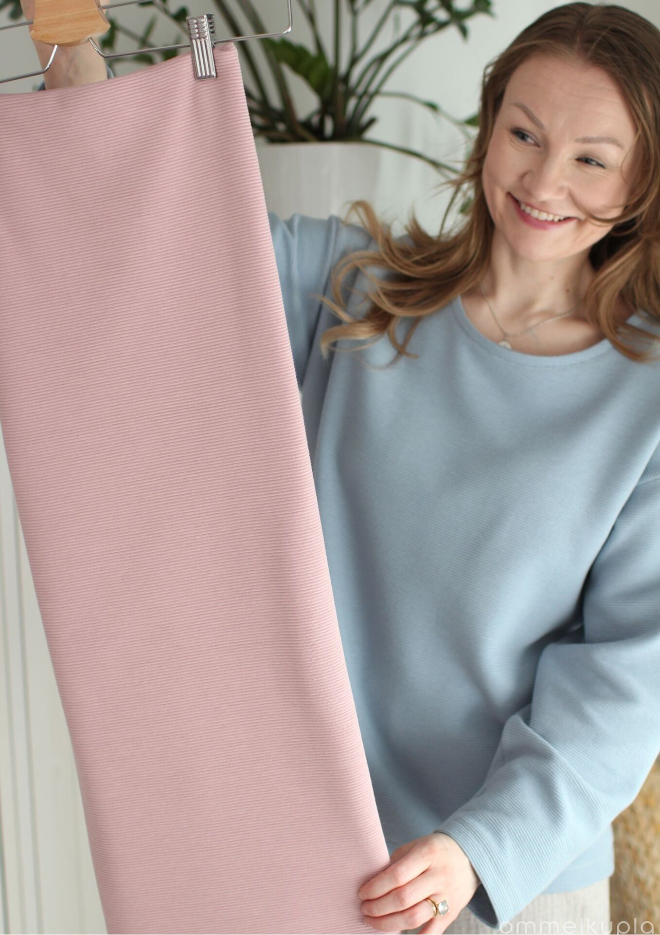 Pehmeä ja notkea ottoman -neulos on täydellinen valinta siisteihin arkivaatteisiin kuin soffalla löhöilyynkin. Se sopii hyvin huppareihin sekä väljiin paitoihin ja siksi onkin niin monipuolinen. Ottoman ei juurikaan jousta, joten rennot ompelukaavan toimivat parhaiten. Vahvuudeltaan ottoman on kuin perus joustocollege, mutta ei niin joustava. Kankaassa on elävyyttä tuova vaakaraidoitus, joka on saatu aikaan neulontatekniikalla. Jos haluat siis jotain muuta kuin peruscollaria, niin valitse silloin tämä ihanuus  ja kaavaksi jokin väljä paita.