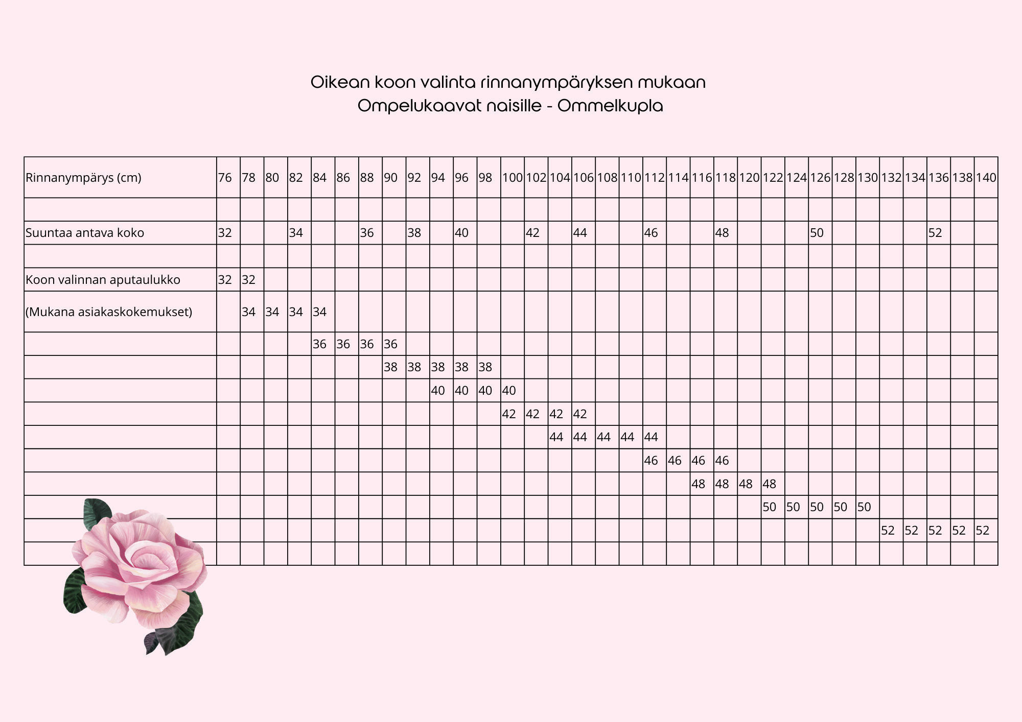 Ompelukaava sisältää aikuisten koot 32-52, joista kokoa 52 käytetään rinnanympäryksellä 140cm.