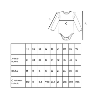 Pienten lasten baby bodyn ompelukaava, jossa on paljon erilaisia variaatioita! Bodyyn on mahdollista lisätä myös frilloja, tuplanepit haaraan pidentämään käyttöikää ja kääntöhihat. Pääntielle on valittavissa tavallisen pääntien lisäksi kietaisumalli sekä neppari olalla. Kietaisumallisen bodyn voit valita kokoihin 44-74. Body on kaavoitettu siten, että voit valita koon lapsen pituuden mukaan. Tämä kaava on melko kapea ja se sopiikin trikoon lisäksi myös ribbitrikoolle. Bodyn reunojen huolitteluun kannattaa käyttää peitetikkikonetta ja näinpä kaava on jo ompelua pidempään harrastaneille, vaikka pienet bodyt vaikuttavatkin helpoilta, ne ovat melko haastavia toteuttaa.